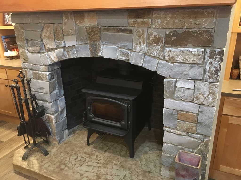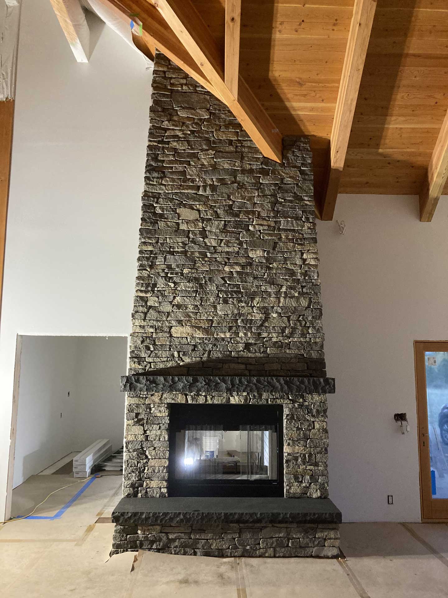 Hand-selected and meticulously fitted river rock fireplace featuring an organic, multi-tonal aesthetic.