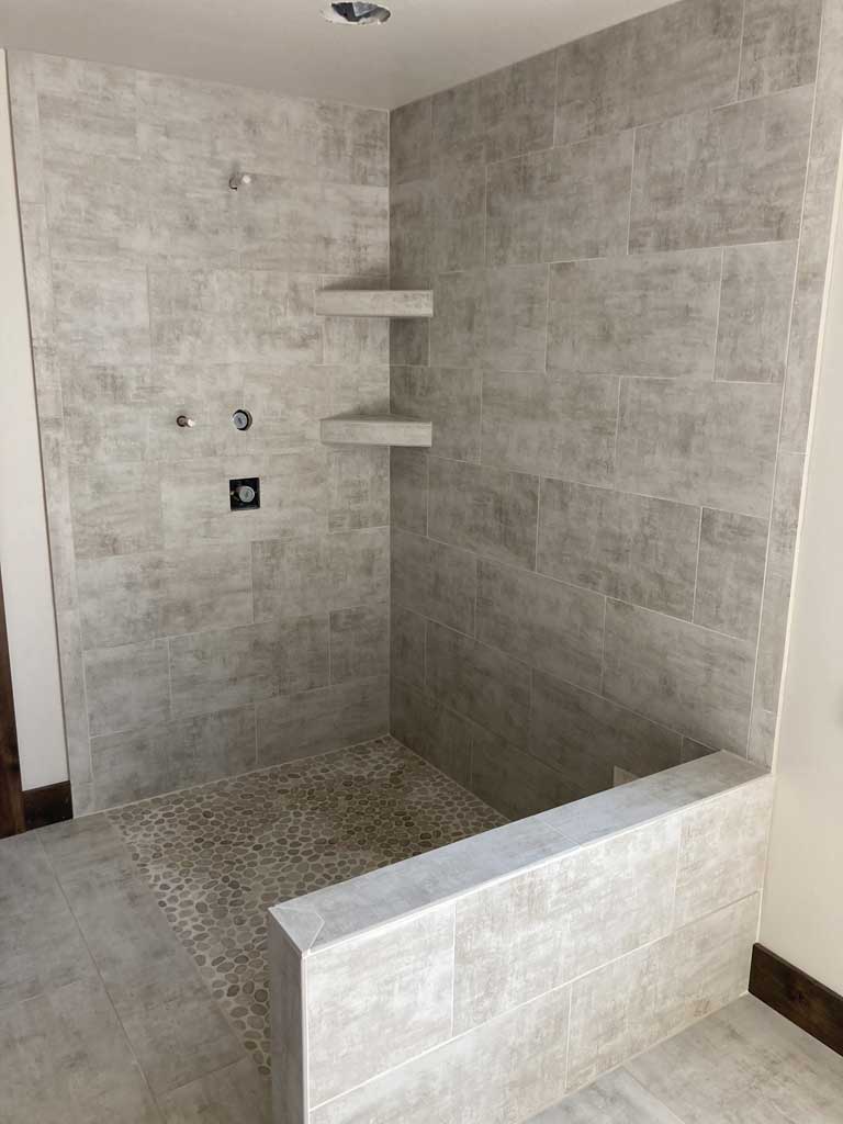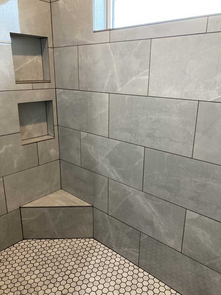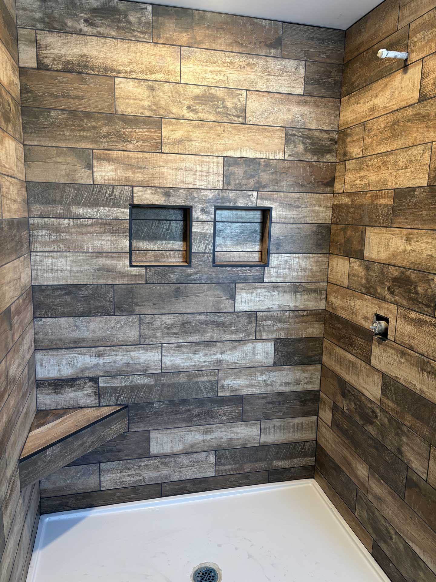 Hand-laid wood-look tile shower design featuring dual recessed storage niches and an integrated corner seat.