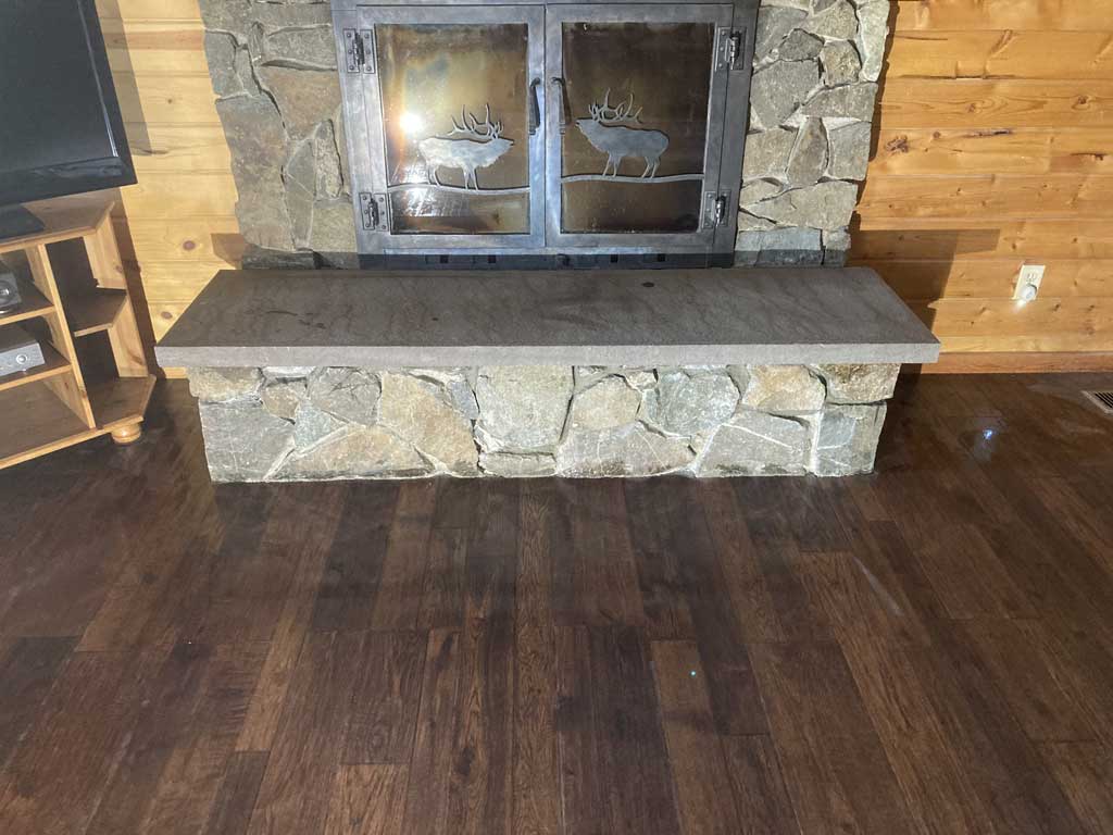Close-up of interior stone masonry highlighting the textural variations of hand-dressed stone on a heavy-duty fireplace hearth.