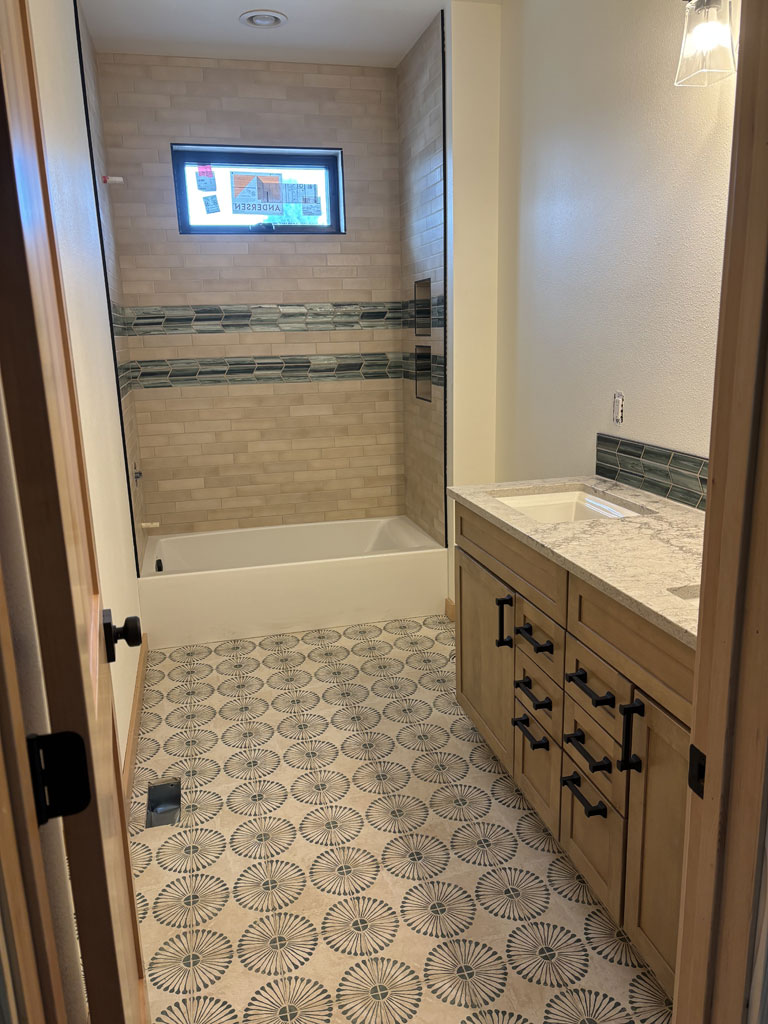 Comprehensive bathroom tile installation. Includes a decorative “medallion” floor pattern and horizontal subway tile with mosaic glass accents.