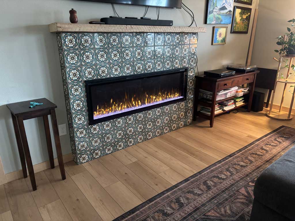 Contemporary fireplace design. Features a bold, repeating patterned tile surround and a reclaimed wood mantel for a modern-eclectic look.
